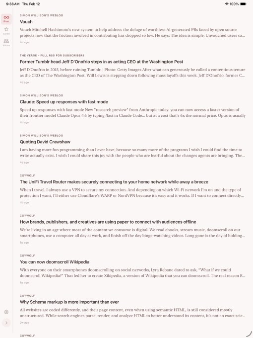 Current, however, proposes a different RSS experience. Instead of structuring feeds as lists to be processed, or unread counts driven to zero, the app’s main screen is a river.