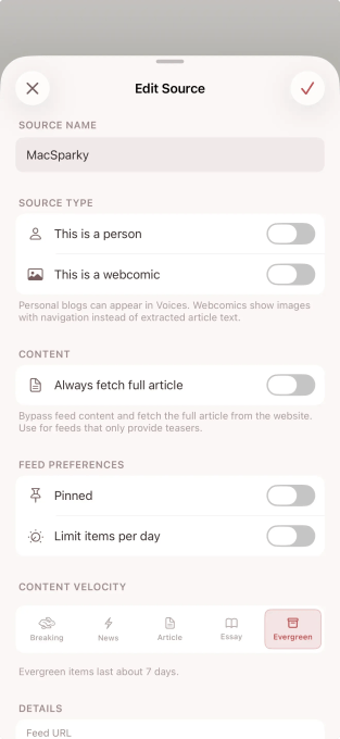 It can fetch the full article text from the web even if the website itself is set to truncate its feeds (as many sites do to motivate people to visit), and you can mark sources as webcomics to unlock an image-first reader experience. You can also mute sources for a week and pin those you can’t miss to the top of the river.